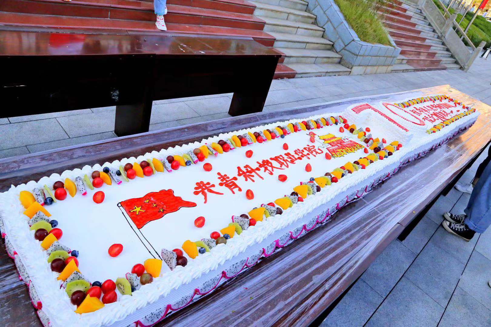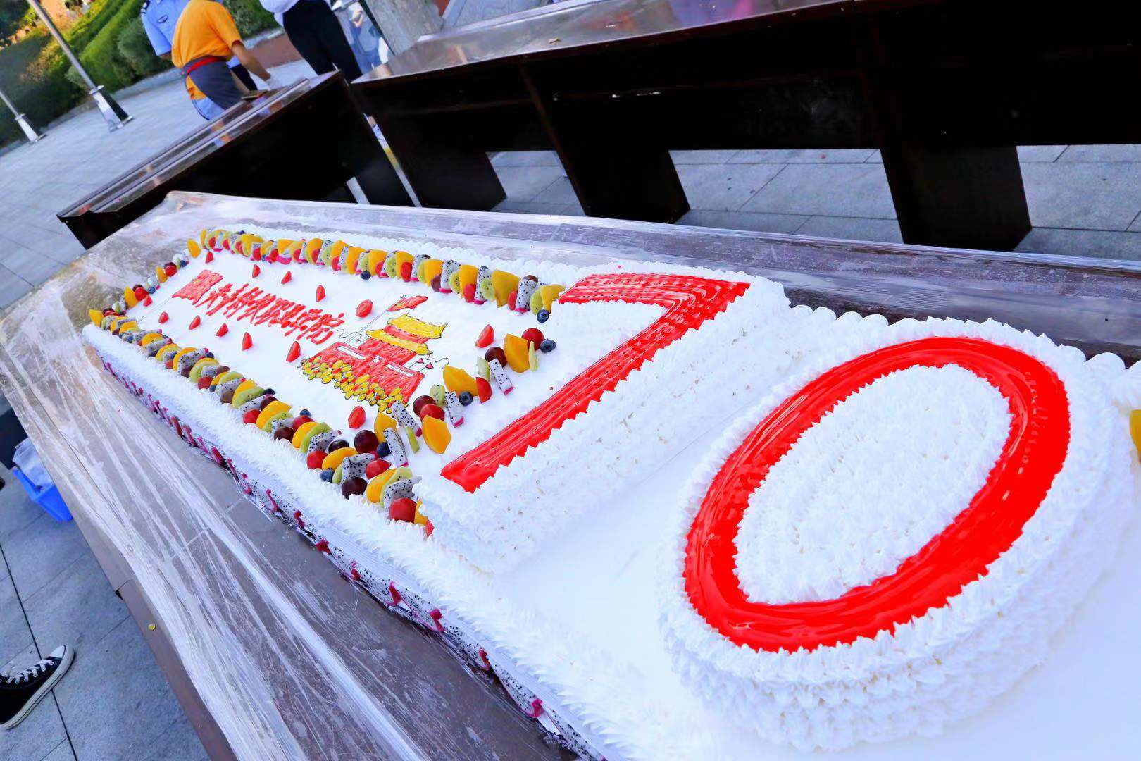 升旗仪式结束后,学校为学生们准备了特别定制的3.6米蛋糕,同学们纷纷拿出手机相机拍照留念,一起分享国庆70华诞的喜悦。