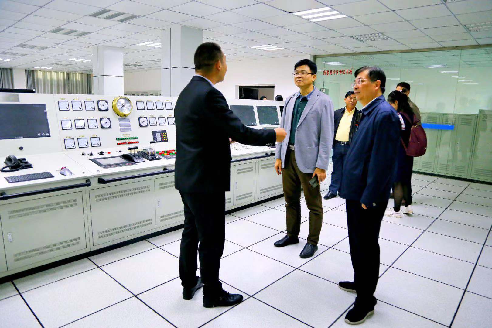 在我校领导的陪同下,文强书记一行先后参观了航海学院、机电学院、教育学院、艺术学院、护理学院实验实训基地,并饶有兴趣地在航海学院船舶操作模拟器上亲身体验。