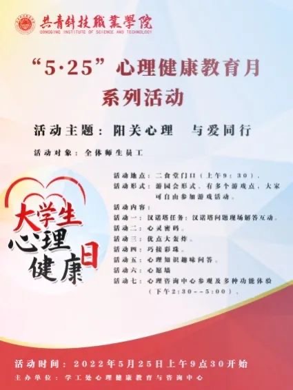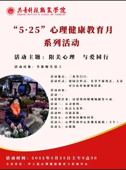 5月25日是全国大学生心理健康日,为了增强学生们对心理健康的重视,进一步提高大学生的心理素质,促进大学生的心理健康和谐,我校学工处心理健康教育与心理咨询中心在学校二食堂门前举办了一场以“阳光心态,与爱同行”为主题心理游园活动。
