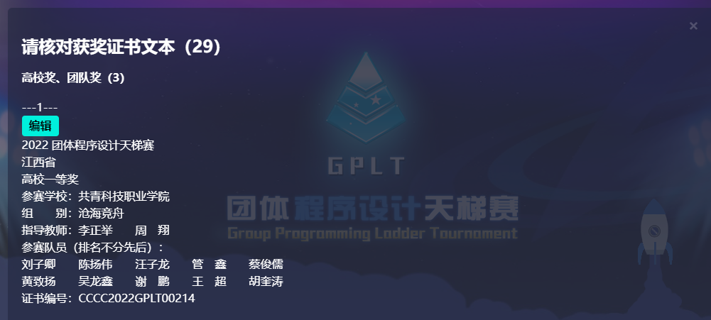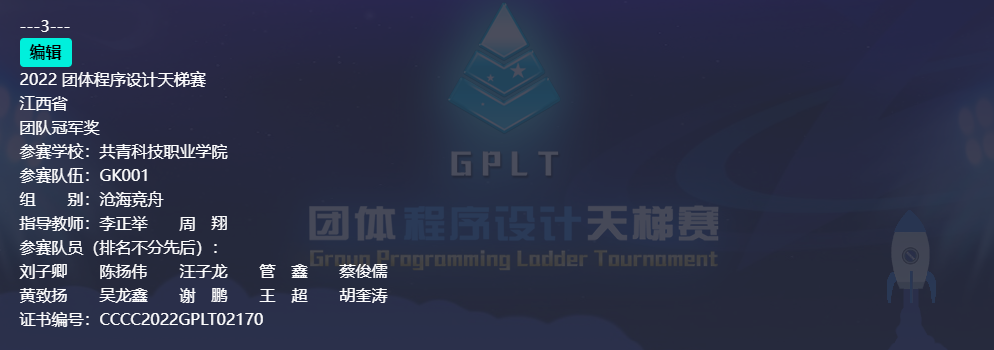 第七届“中国高校计算机大赛-团体程序设计天梯赛”本届赛事共有1433支代表队参赛,共计参赛选手一万四千余人,是全国高等学校计算机教育研究会主办的一年一届的国家B类技能大赛,分为珠峰争鼎(本科组)、华山论剑(本科组)、沧海竞舟(专科组)三个组别,有全国高校排名、全国团队排名、各省份高校排名、各省份团队排名以及个人排名。