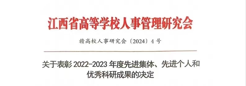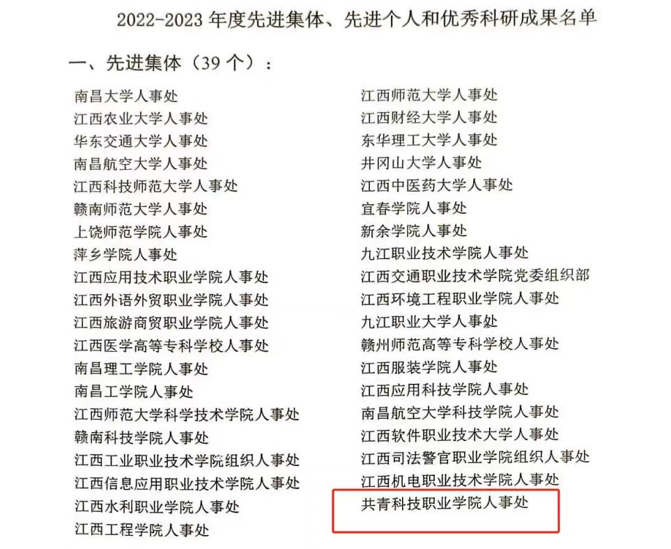 日前,江西省高校人事管理研究会印发关于表彰 2022-2023 年度先进集体、先进个人和优秀科研成果的决定。我校人事处荣获2022-2023年度“先进集体”荣誉称号,是唯一获此荣誉的江西省民办高职院校。