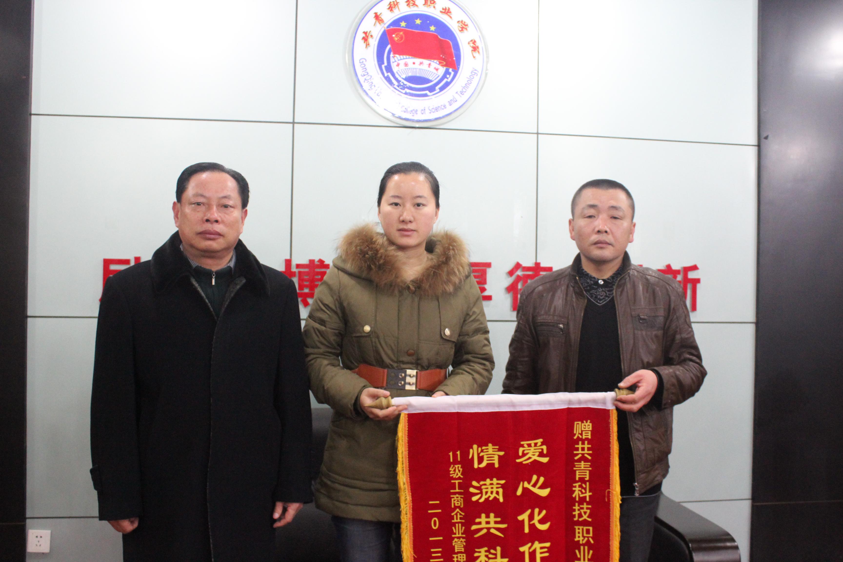 2013年12月17日上午,我校“白血病”患者王妍同学的父亲从安徽合肥赶到学校,向为王妍同学奉献爱心的母校送上“爱心化作及时雨,情满共科树英才”锦旗一面。