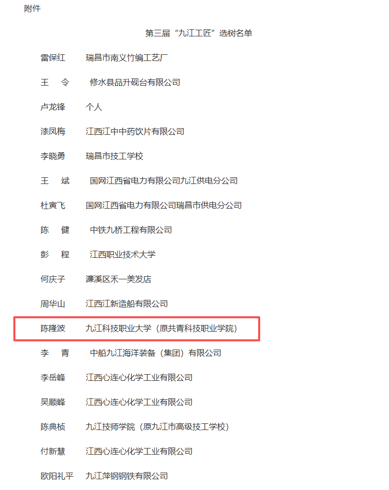 近日,九江市人力资源和社会保障局等部门联合发布《关于选树雷保红等19名同志为“九江工匠”的决定》,九江科技职业大学陈隆波教授入选第三届“九江工匠”名单。