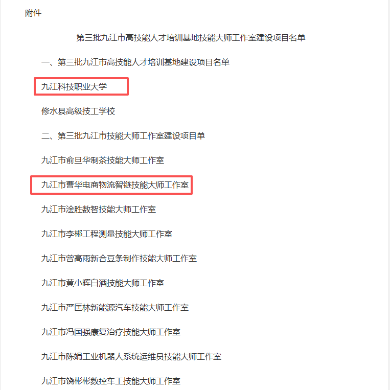 近日,九江市人力资源和社会保障局正式公布第三批九江市高技能人才培训基地和技能大师工作室建设项目名单。九江科技职业大学凭借扎实的办学基础与突出的技能人才培养能力,成功入选九江市高技能人才培训基地,同时,“曹华电商物流智链技能大师工作室” 获评九江市技能大师工作室建设项目。
