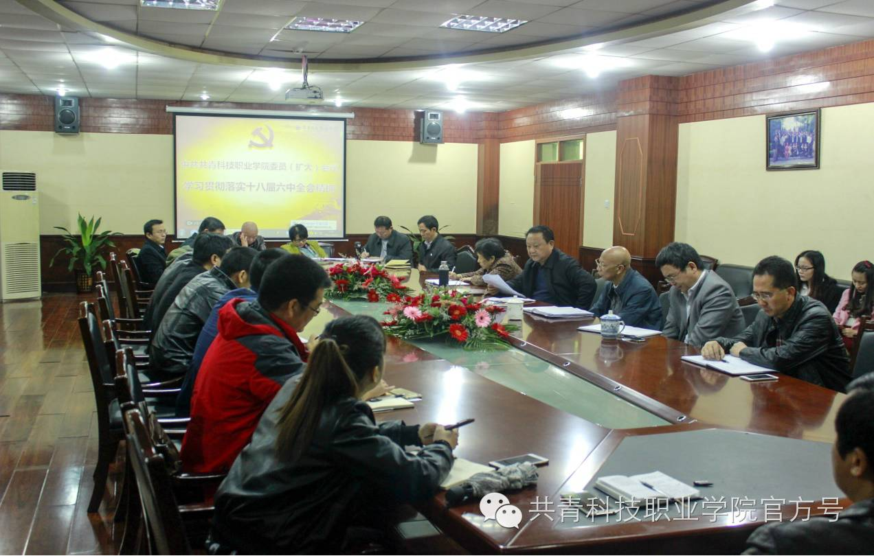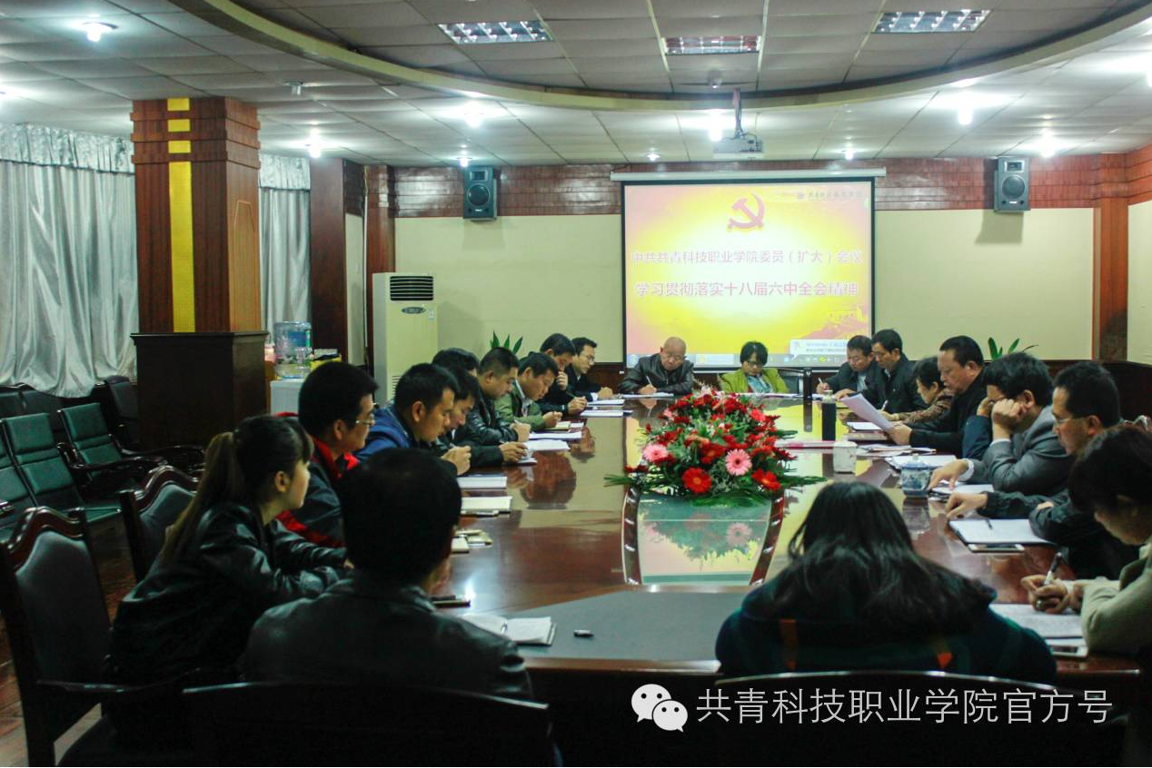 2016年10月31日,我校党委在大厦三楼会议室召开党委(扩大)会议,学习贯彻落实十八届六中全会精神。参加会议的有校党委书记张华东,党委副书记、校长扶名福,常务副校长肖玉梅及党委委员袁定培、李军、孙学东、杨其龙、各党支部书记、各二级学院负责人和各处室负责人等。