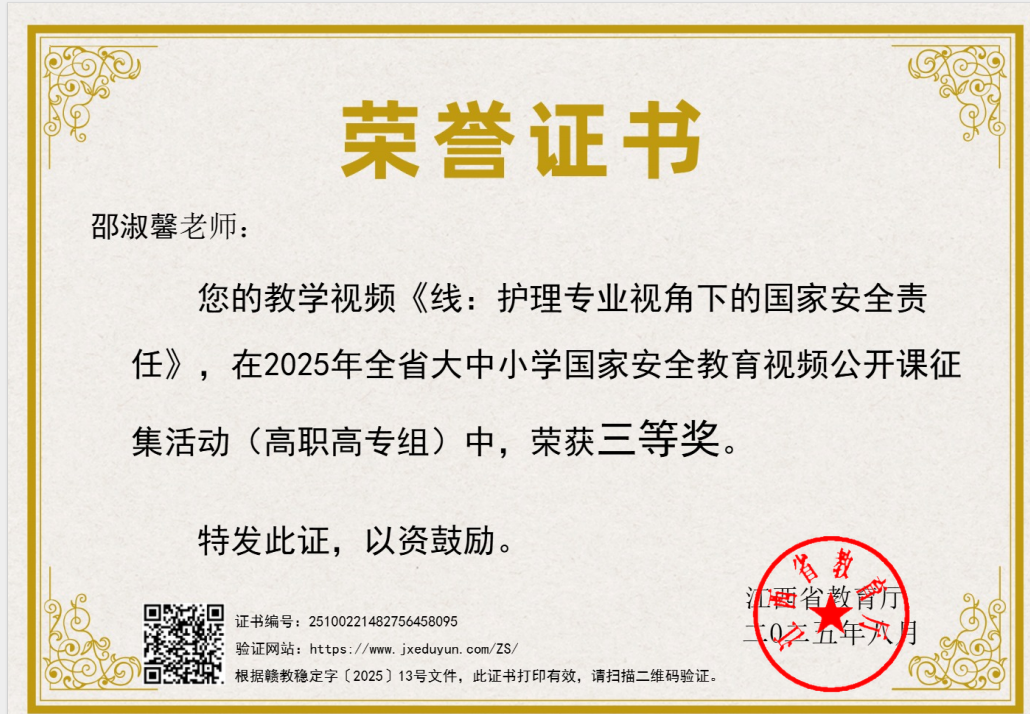 近日,从江西省教育厅传来好消息:我校邵淑馨老师的教学视频《线:护理专业视角下的国家安全责任》,在2025年全省大中小学国家安全教育视频公开课征集活动(高职高专组)中斩获三等奖!