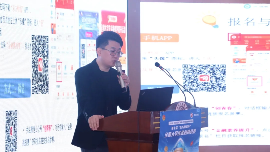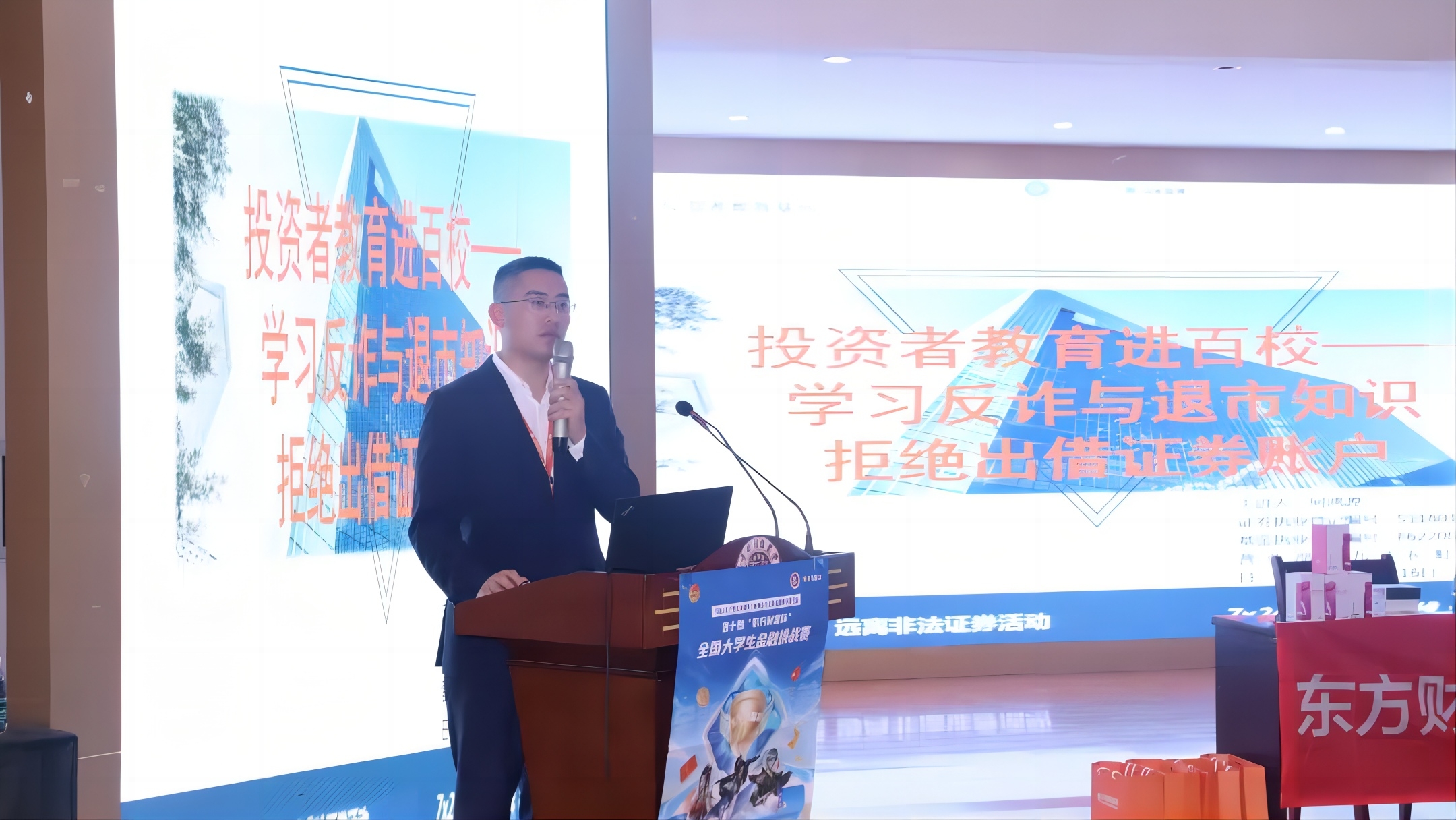 讲座伊始,华东高校合作负责人谭潭老师介绍了第十届全国大学生金融挑战赛活动安排,为我校师生带来了详细的赛事解读。其后,东方财富证券股份有限公司九江长虹西大道证券营业部合规经理何鸿源先生,用多个形象生动的案例讲述了网络电信诈骗的危害。他希望通过此次大赛提高大学生辨别合法金融服务的能力,谨防落入诈骗陷阱,维护好自身的合法权益。他还通过答疑解难,给予了金融专业的同学们就业与投资方面的宝贵建议。![]()