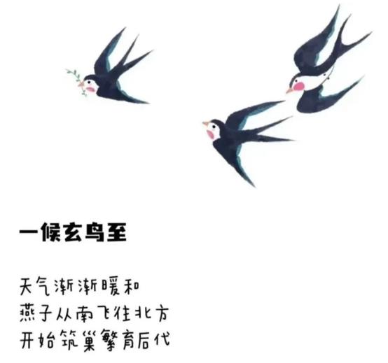“燕来还识旧巢泥”,春分初候“玄鸟至”。玄鸟即燕子,在我国黄河流域,燕子南飞时,就是秋分,天气由暖转凉;当燕子飞回,春分时节便到了。
