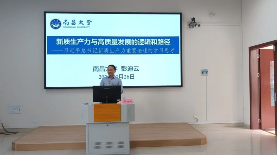 3月26日下午,我校邀请南昌大学经济管理学院教授、博士生导师、江西省高校中青年学科带头人和省级教学名师彭迪云博士进行了主题为“新质生产力与高质量发展的逻辑和路径——习近平总书记新质生产力重要论述的学习思考”学术讲座,讲座由经济管理学院院长陈剑林教授主持,近百名经济管理学院师生参与了本次学术讲座。