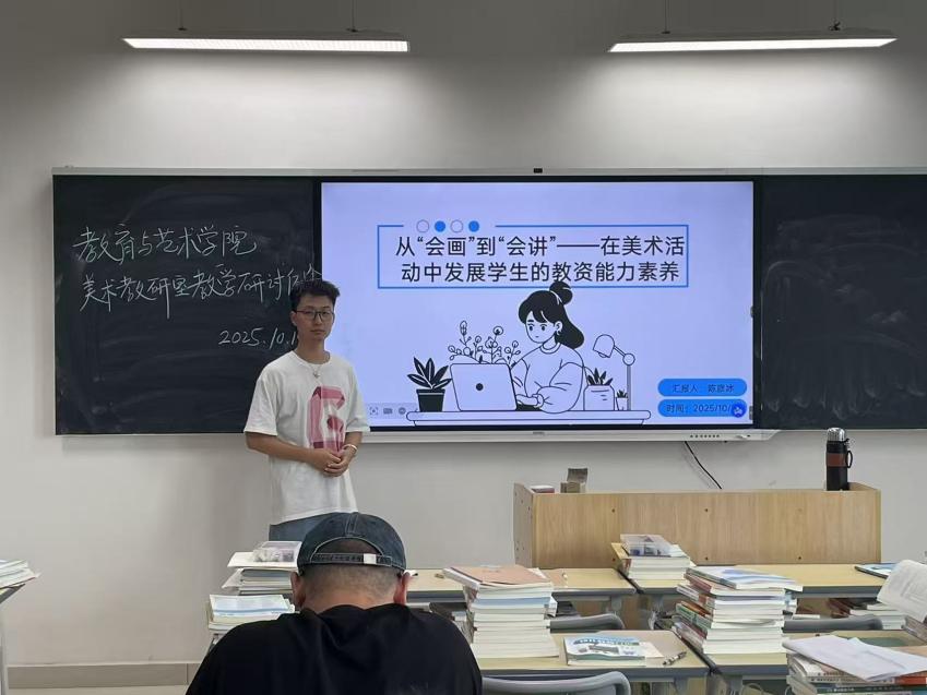 教师是教育事业发展的基础,师范生教资能力素养的培育直接关系到未来教学质量的提升。为切实解决学前教育专业美术教学中学生“绘画技能扎实但讲解能力不足”的突出问题,2025年10月14日,学前教育专业美术教研室在4号楼208教室举办了“从‘会画’到‘会讲’”主题教研活动。 活动由教研室主任贺晋组织,陈彦冰老师主持,全体教师参会,共同围绕如何在美术活动中发展学生的教资能力素养展开深入研讨。