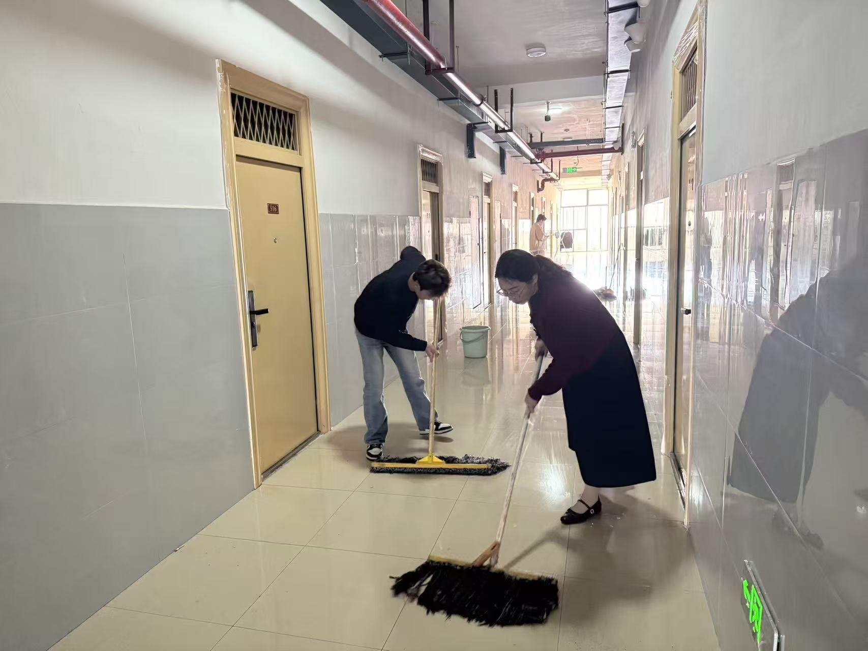 活动伊始,张书记作了简短动员。她强调了劳动教育对于青年学生树立正确价值观、锤炼意志品质的重要性,指出“党员先行”不仅是一句口号,更是沉甸甸的责任与担当。她要求全体入党积极分子通过此次劳动实践,深刻体会“幸福是奋斗出来的”内涵,将吃苦耐劳、求真务实的作风内化于心、外化于行,在服务同学、美化环境中强化责任意识,真切感悟“为人民服务”的党的根本宗旨。动员结束后,张书记率先拿起清扫工具,投入到劳动中。她身先士卒,与同学们并肩作战,重点对七栋宿舍楼的公共区域,包括楼道、楼梯等进行了彻底的清理。活动前,部分区域存在卫生死角,如地面残留的污渍、墙角积存的蜘蛛网、随意丢弃的零星垃圾等,影响了楼栋的整体环境。