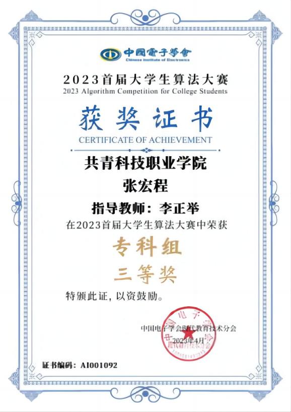 张宏程,男,中共预备党员,信息工程学院2021级计算机网络技术1班纪律委员。