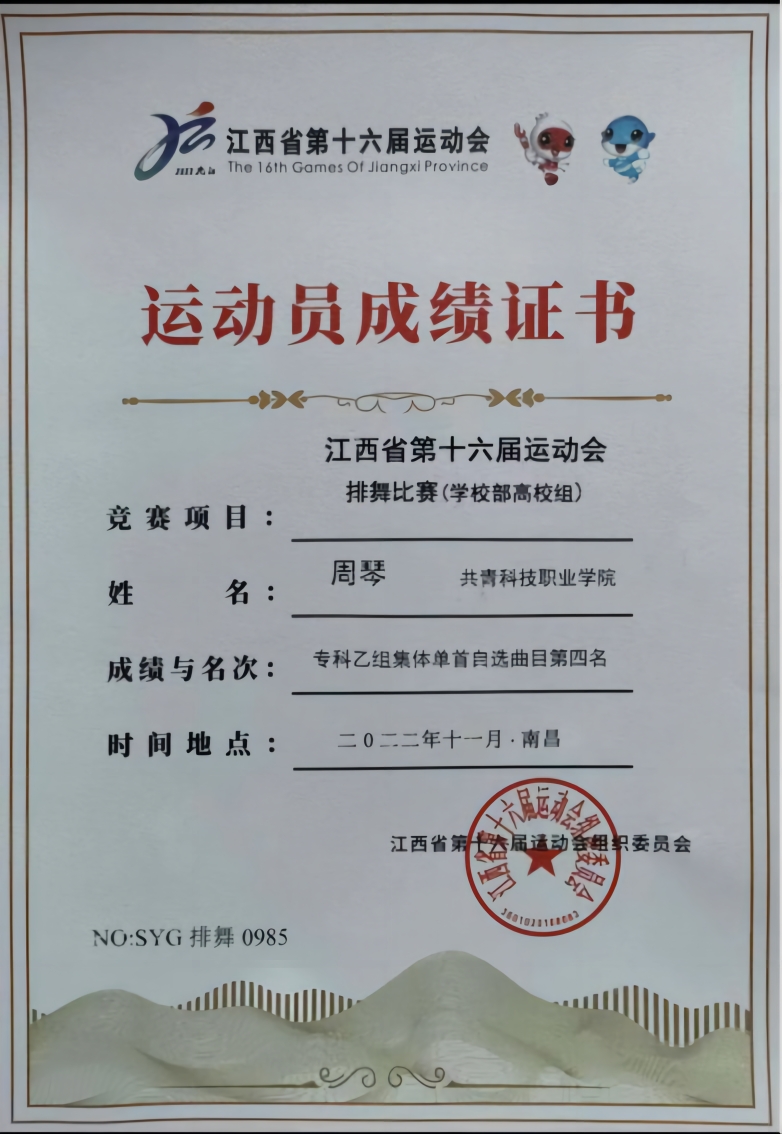 课余时间积极参加比赛,获江西省第16届运动会排舞比赛专科乙组集体串烧自选曲目第二名、江西省第16届运动会专科乙组集体单曲规定曲目第二名、2023年第二届中昌红网杯大众跆拳道高校乙组第三名。