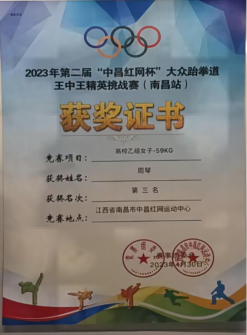 成绩优异,学习成绩2022-2023学年班级排名第一,获得2022-2023年度“三好学生”、九江市跆拳道协会“优秀老师”称号。