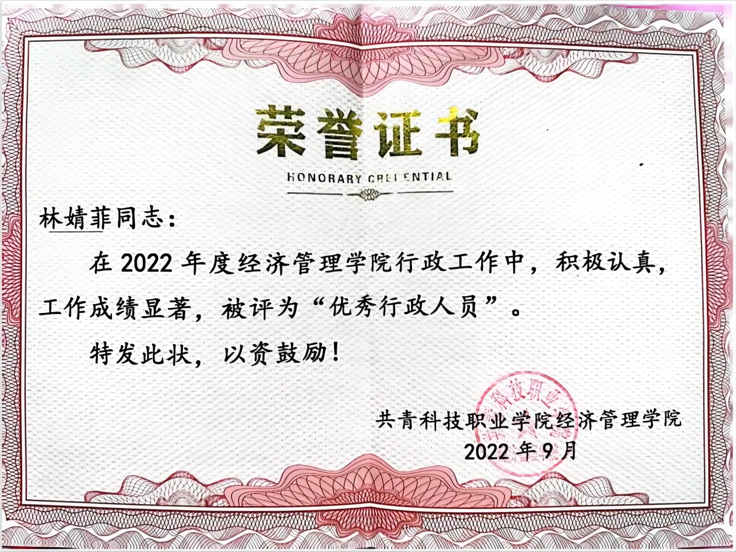 林婧菲,女,毕业于云南师范大学,2021年8月进入共青科技职业学院经济管理学院担任专职辅导员,2022年9月担任经济管理学院学工干事兼资助干事。多年的学生、辅导员工作经历,林婧菲形成了独特的个人魅力和教育经验。