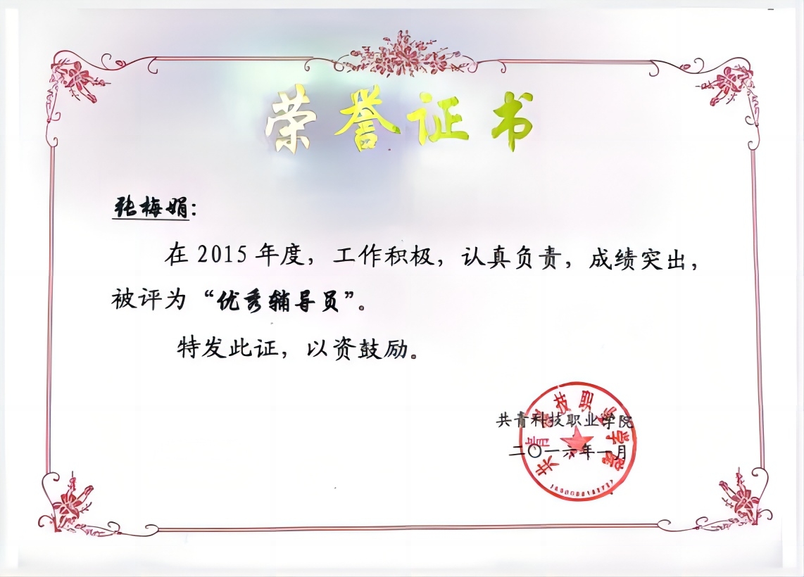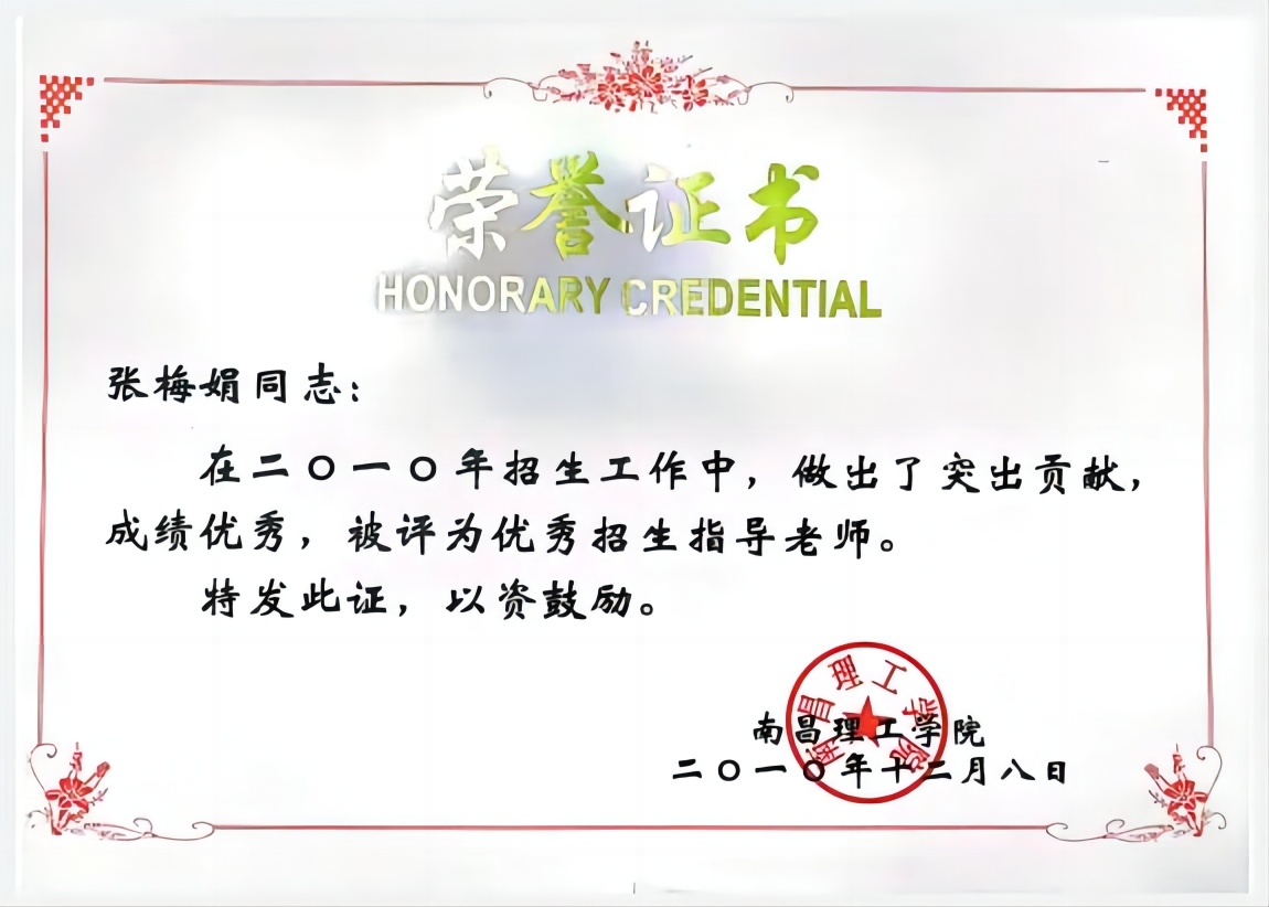 张梅娟同志把职业当成事业去坚守,把事业当成专业去研究。工作之余,她从不忘提高自己,不仅积极参加学校组织的各项培训,还主动研究工作,反思工作,竭尽全力将工作做到尽善尽美。她的工作态度和工作表现得到了多方认可,职业生涯中,多次获得“优秀班主任”、“优秀招生老师”、“优秀指导员”、“优秀辅导员”、“先进工作者”“优秀党员”“平安校园先进个人”等荣誉。担任辅导员期间,她所带班级学生就业率排名前列,曾获“就业先进个人”荣誉称号,并且多次获得辅导员考核优秀等次。