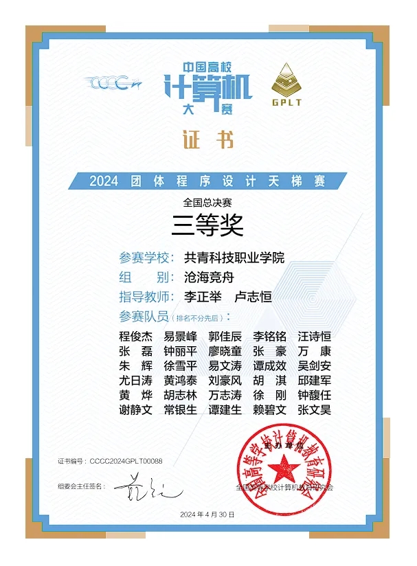 近日,信工学院师生参加第九届“中国高校计算机大赛-团体程序设计天梯赛”,获国家级团体三等奖1项,江西省团体一等奖2项,二等奖1项,三等奖1项。
